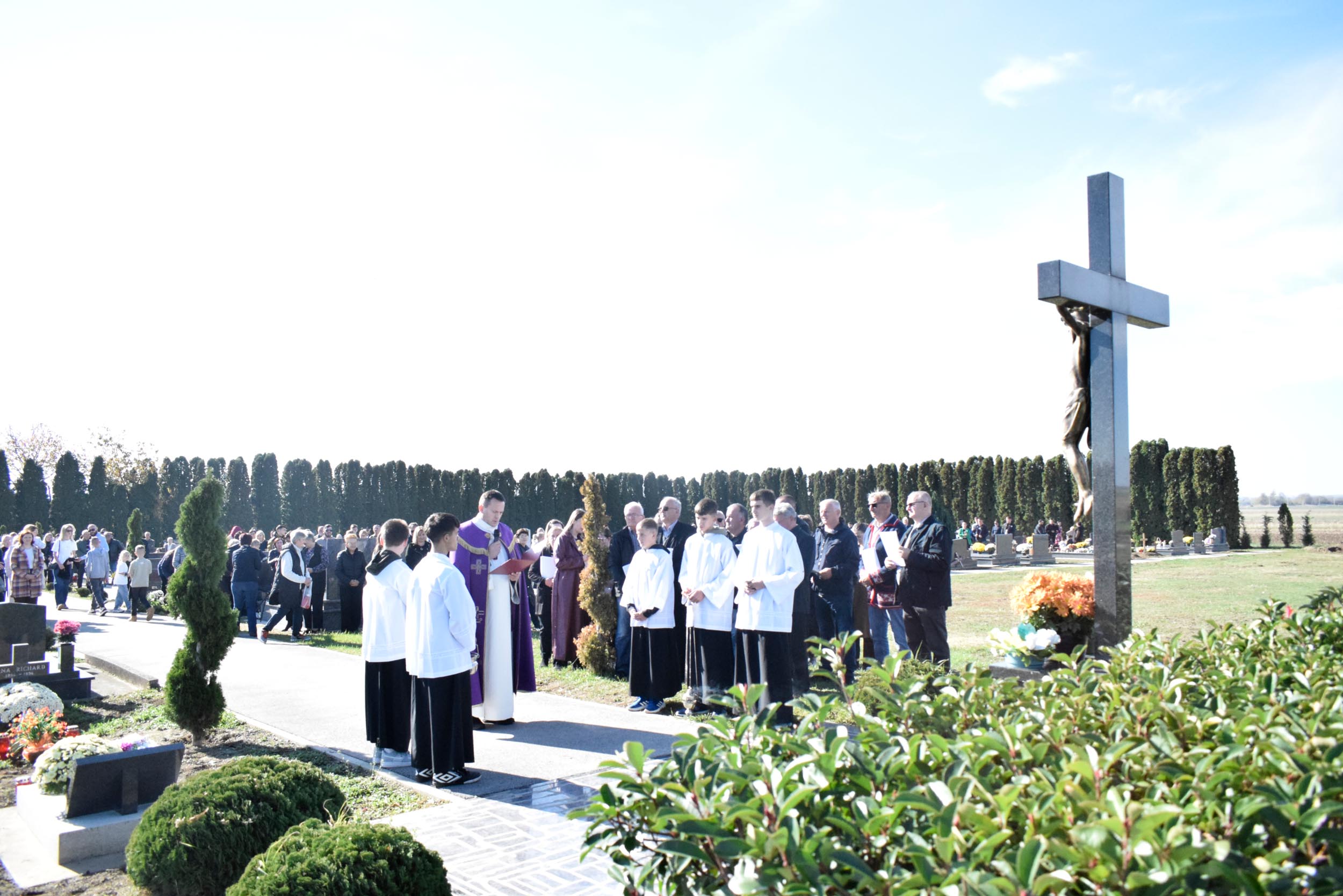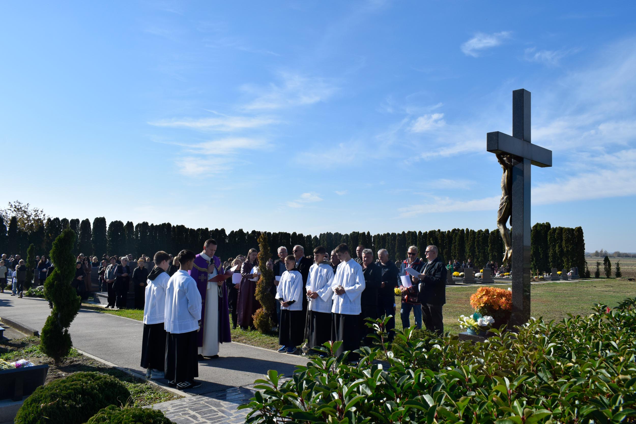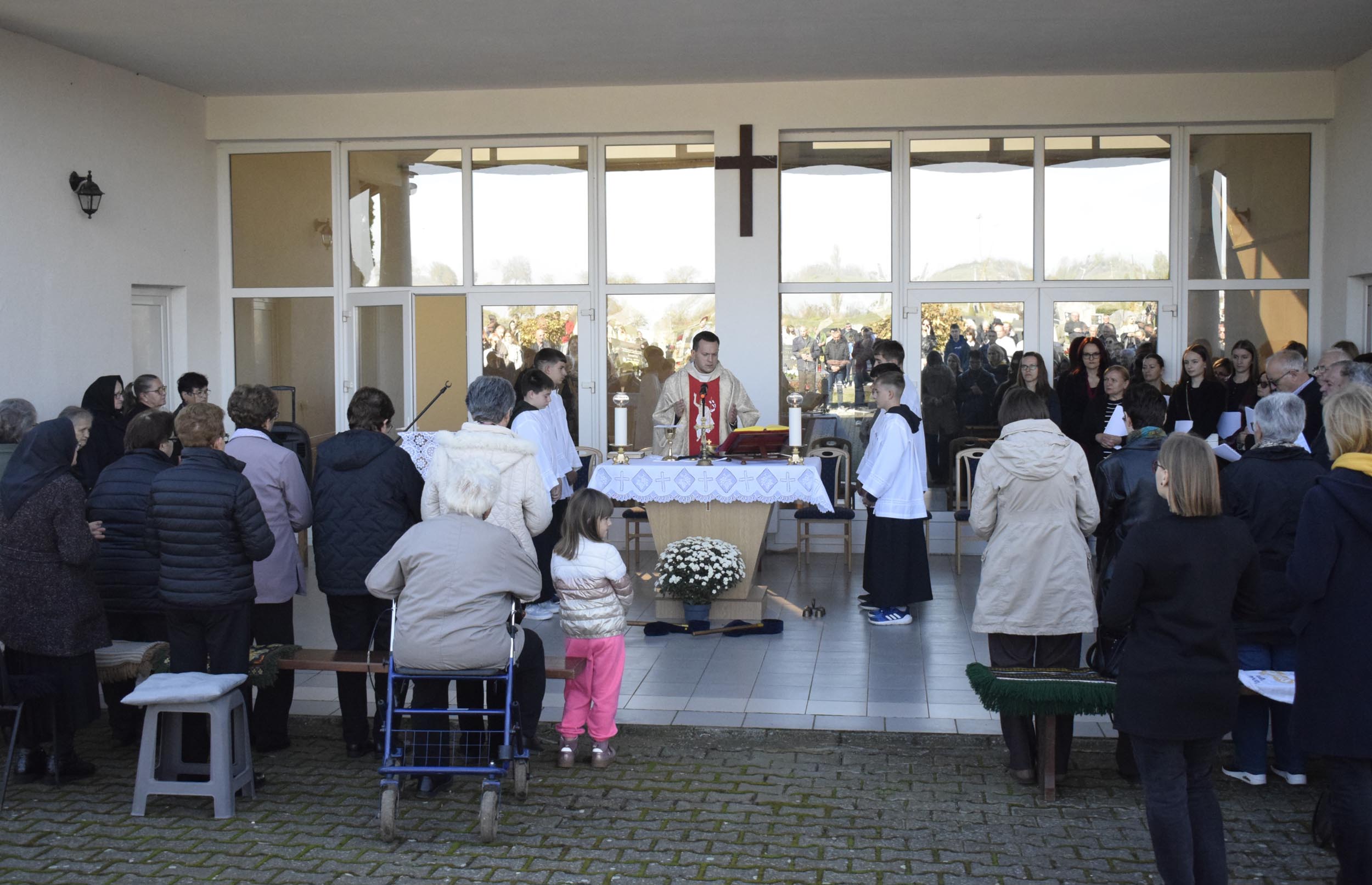 Uvodeću u misno slavlje vlč. Bilić govorio je o slavlju svetkovine Svih svetih te istaknuo: “U zajedništvu smo jednog srce i jedne duše, ne samo sa posjetiteljima groblja i svima koji smo se okupili, već i sa svim spašenicima na nebu koji pripadaju proslavljenoj crkvi i s dušama u čistilištu. Oni su trpeća Crkva, a mi na zemlji tvorimo putujuću Crkvu, budući da putujemo prema našoj domovini koja je na nebesima, kako je rekao sv. Pavao” rekao je između ostalog u svom uvodu u misno slavlje vlč. Bilić.