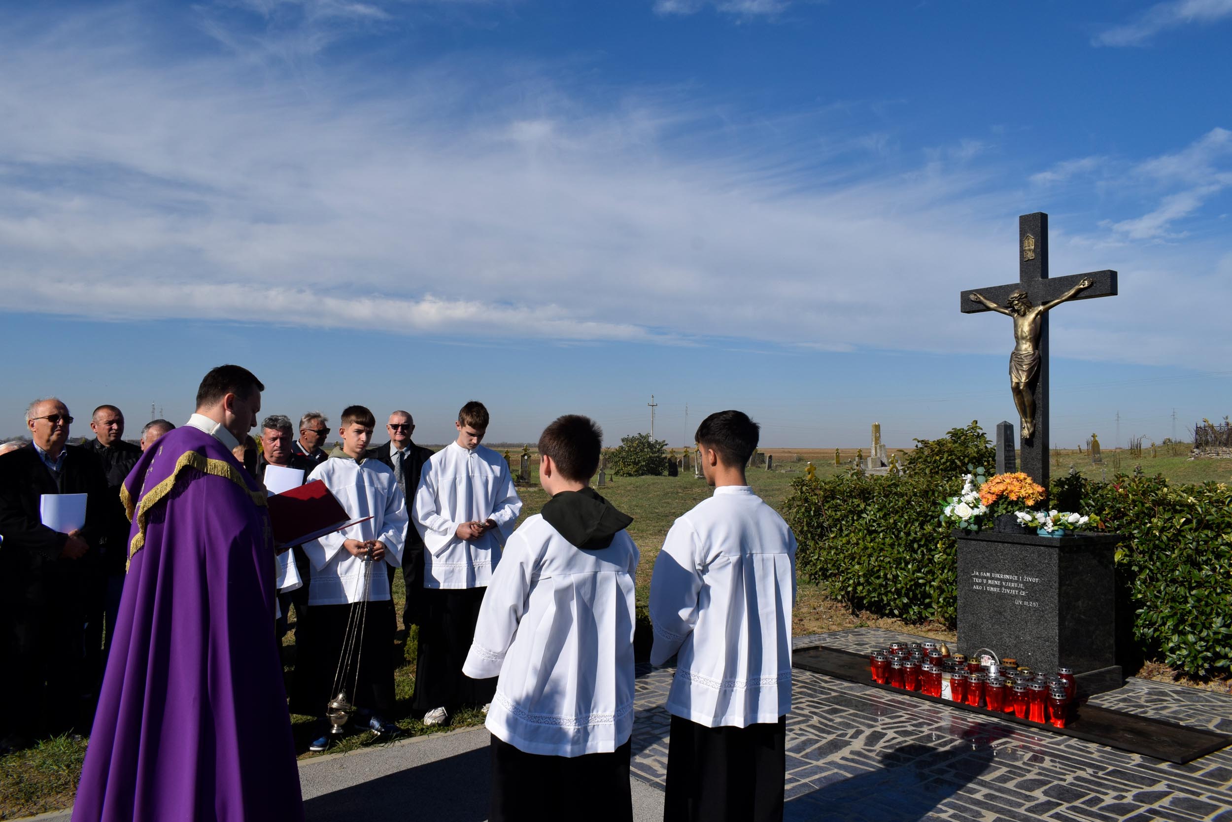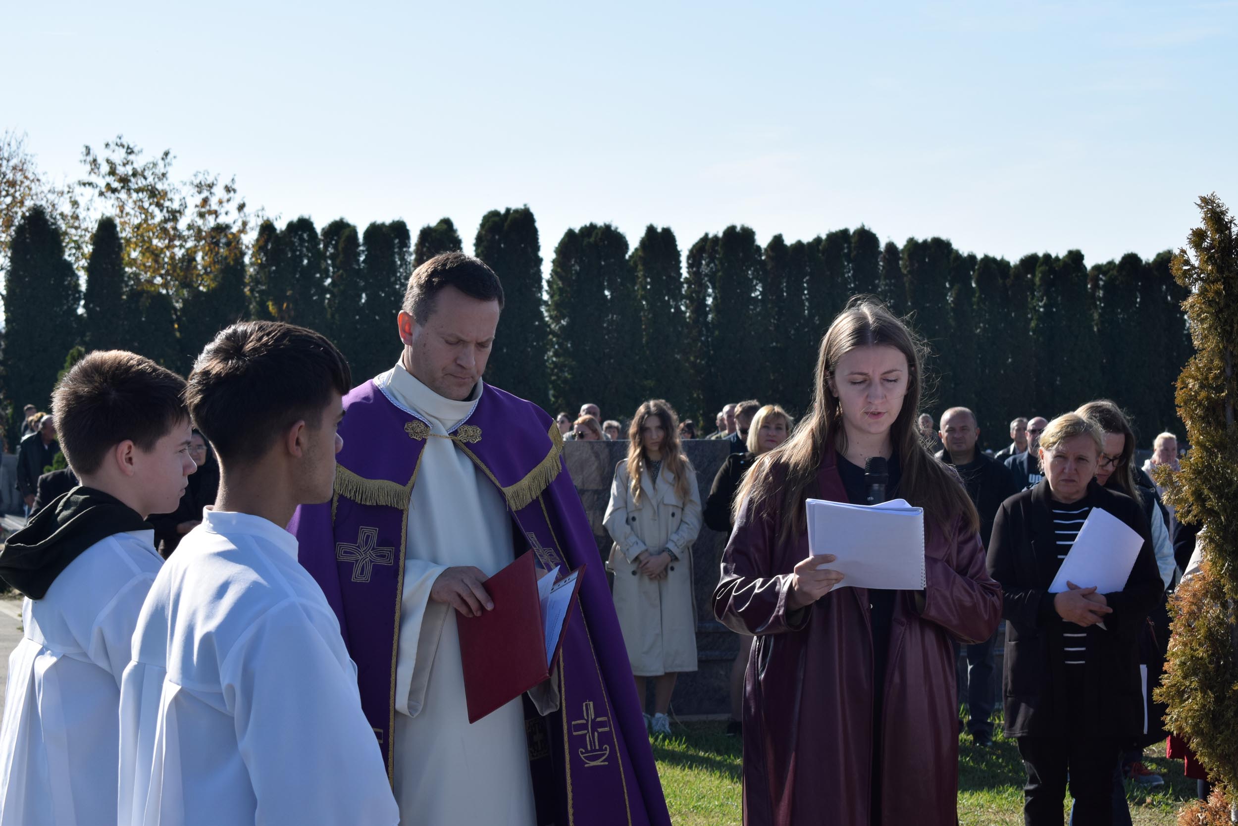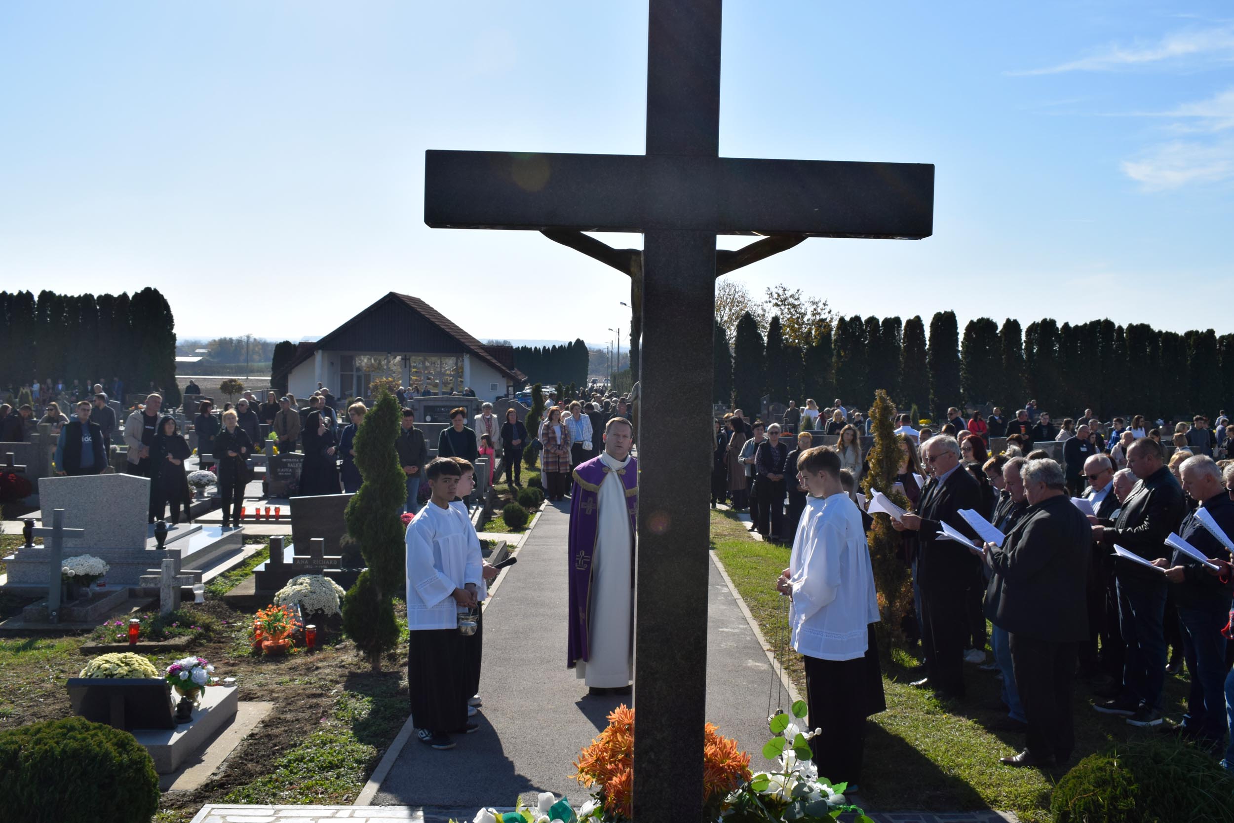 Uvodeću u misno slavlje vlč. Bilić govorio je o slavlju svetkovine Svih svetih te istaknuo: “U zajedništvu smo jednog srce i jedne duše, ne samo sa posjetiteljima groblja i svima koji smo se okupili, već i sa svim spašenicima na nebu koji pripadaju proslavljenoj crkvi i s dušama u čistilištu. Oni su trpeća Crkva, a mi na zemlji tvorimo putujuću Crkvu, budući da putujemo prema našoj domovini koja je na nebesima, kako je rekao sv. Pavao” rekao je između ostalog u svom uvodu u misno slavlje vlč. Bilić.
